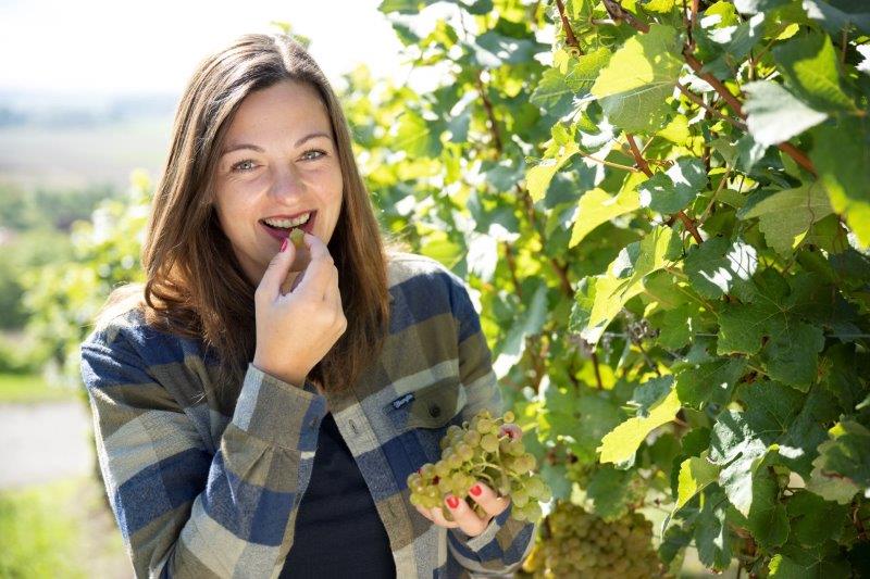 Kerstin baut ihre Weine nicht nur klassisch aus, sondern wagt auch experimentelle Wege. Und so kocht sie auch: als Eröffnungsmenü gibt es Salat mit Weißweindressing, Wachteleiern und Fächerkartoffeln, in der Pfanne geräuchertes Rinderfilet mit Verjus-Sauce, Semmelknödel und Kürbis-Pastinaken-Gemüse und typisch fränkische „Apfelkräpfla“ mit zweierlei Weincrème. Kerstins kulinarischer Schatz, die Trauben, geben jedem Gang den besonderen Pfiff. Neben einer Führung übers Weingut erleben die Gäste die Schönheit des Waldes aus einer ganz neuen Perspektive. Sie genießen den Fernblick über Kerstins Heimat vom Baumwipfelpfad Steigerwald.